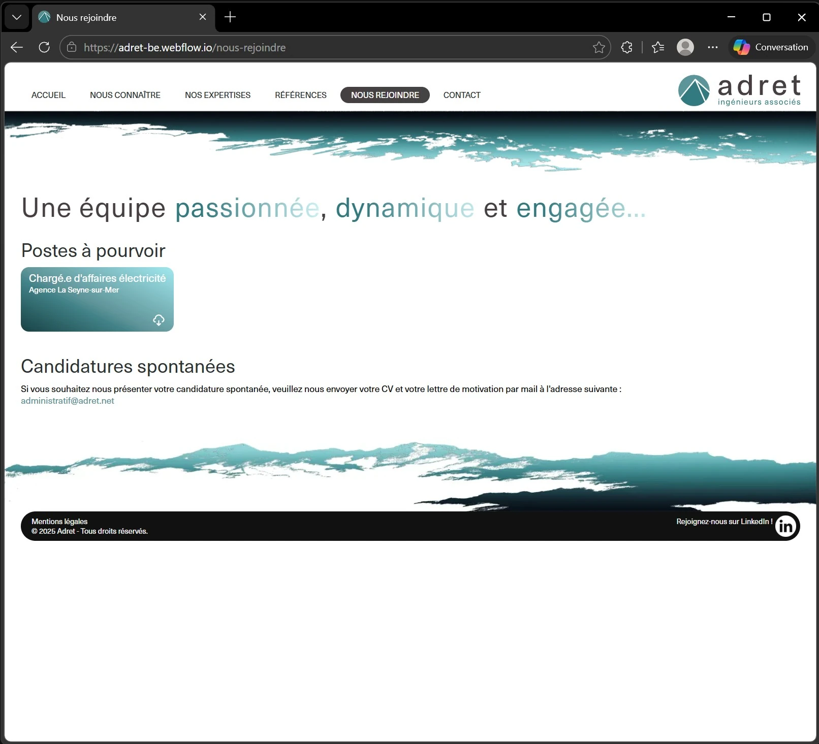 I had the great opportunity, and the challenging task, of creating the website for Adret, www.adret.net, an engineering consultancy in the building sector focused on Environmental Quality. The goal was to design a visual space, based on the logo’s colors, that would enhance and frame the information. All graphic elements were hand-drawn, scanned, and then refined in Photoshop. My first step was to explore and deeply understand their commitment to environmental responsibility, while situating them within their geographical context : between sea and mountains. The gradients bring dynamism, with saturated tones for modernity and contrast, creating a sense of infinity and continuity, and extending the perceived dimension.